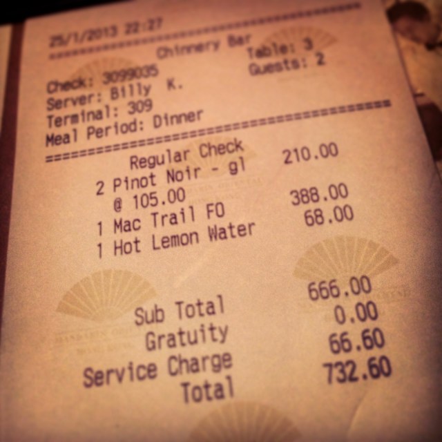 Order two glasses of Pinot Noir and because you’re young women who take good care of their uteruses (just ask any doctor of Chinese medicine), you order two hot waters with lemon. The bill comes and whoa, the price of the two hot waters costs more than your entire dinner for three at the noodle house. You shamelessly argue with the server in the white jacket who says, “This is what we charge here.”