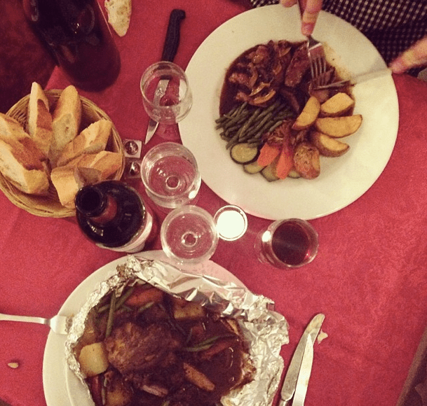 Our last dinner at Au Pied du Sacre Coeur, located at…the foot of the Sacred Heart in Monmartre. That is lamb on the bottom and another duck under Tom’s knife. So many ducks, so little time.