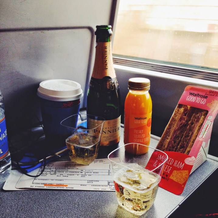 On the Eurostar, I, hungover from Tom’s company holiday party the night before, napped. When I woke up, Tom had placed before me a ham sandwich, orange juice, and champagne. “Let’s celebrate! We’re going to Paris!” Thus was born a new train tradition (a drink and a “sando” as Tom calls it) and one of our favorite memories of the entire trip.