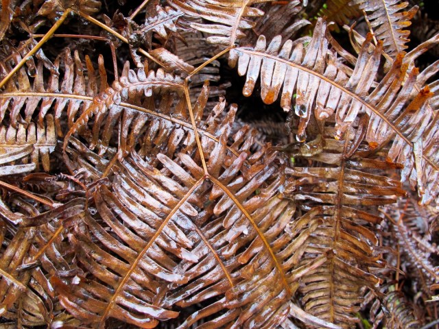 Wet, dead fern leaves on a hike. My mother was glum because her feet were wet.