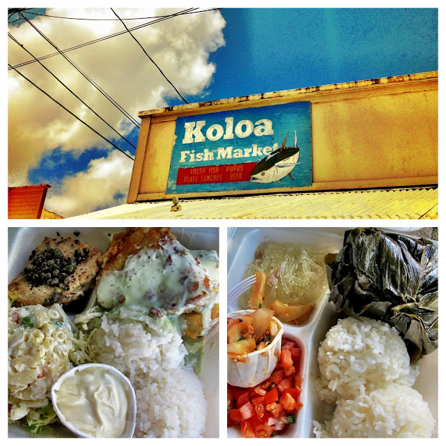 One of my favorite stops, in Old Koloa Town. It was sweltering that day and fish markets don’t exactly have seating, but we found a shady tree nearby and chowed down on their Hawaiian Plate with Lau Lau (pork wrapped in Taro leaves, which was very reminiscent of a similar Chinese dish) and fish cooked two ways (ahi and mahi mahi). Both were great and my mother, not a big meat eater, enjoyed the Lau Lau, which was like baby back ribs except without the ribs and the barbecue sauce… yeah.