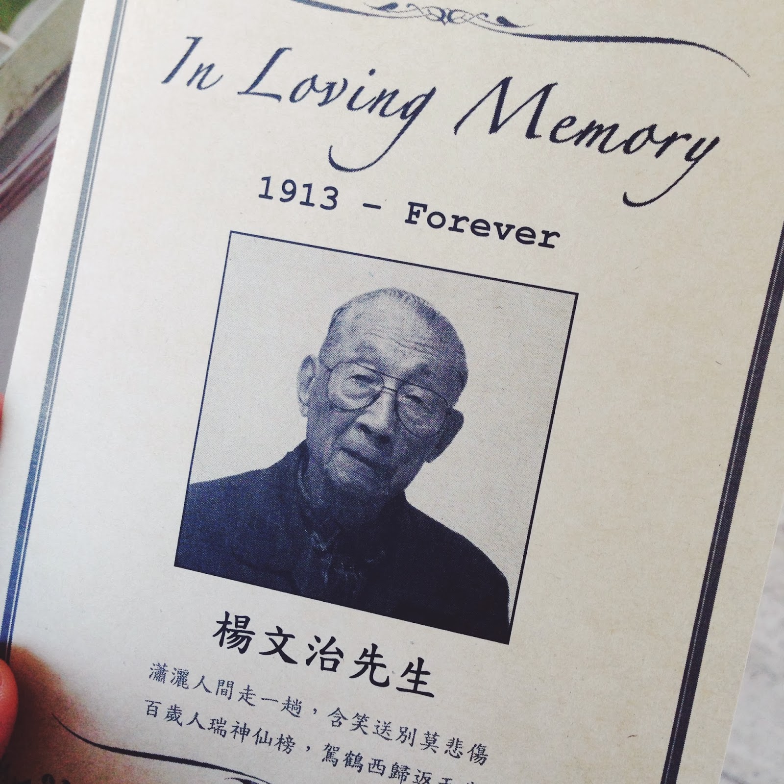 Last Sunday November 11 at my grandmother’s funeral, I spotted Grandma Dai’s white mane from a mile away. She walked slowly on her granddaughter’s arm towards the chapel where two long lines of grandchildren stood all in black to welcome attendees. As her figure grew closer I saw that she wore a single black glove on her right hand and oval spectacles fitted with transition lenses. Aside from the mournful expression on her face, she appeared to be in good health. She had maintained her slender frame despite having shrunk a few inches since we last met and walked more steadily than my grandmother could in the last two years. Grandpa Dai was just a few steps behind, also in good health. They both moved, at least it seemed to me, without pain or shortness of breath, without walkers or canes, apparatuses that had become necessary in my grandmother’s last year. When they saw my grandfather, now an old widower, grandma Dai broke out into silent, heaving sobs. He patted her on the back and told her to buck up.
