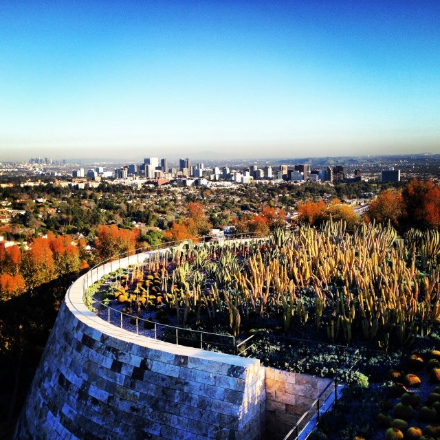 The day was sparkling clear with just the faintest layer of smog hanging over Downtown, and everywhere we looked it was just miles and miles of Los Angeles in all its spread out splendor. There! West Hollywood and UCLA; there! that tall cluster, Downtown LA, and over there, Santa Monica, sitting before the deep crystal blue of the Pacific and of course the long undulating hump of Catalina Island. And before all that there were the Getty’s own beautiful gardens. The older women walked, more often in silence than chattering, as I thought they would, with their heads either bent low or looking up, hands held lightly behind their backs. They wondered about the various plants and the stones and the logistics of construction.